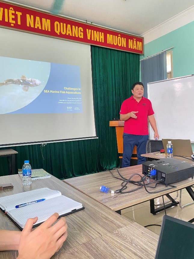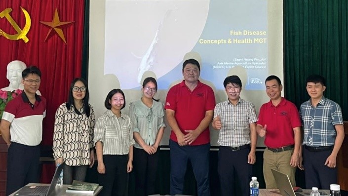Sáng ngày 03/04/2024, Nhóm NCM Bệnh Thủy sản – Khoa Thủy sản phối hợp cùng các chuyên gia khách mời đến từ Hiệp hội Đậu tương Hoa Kỳ (USSEC) tổ chức buổi seminar khoa học với chủ đề môi trường và bệnh cá biển. Tại buổi chia sẻ, TS. Hsiang Pin Lan – USSEC đã có những trao đổi về chủ đề: “Bệnh cá biển”. Buổi seminar do PGS.TS. Trương Đình Hoài là chủ tọa với sự tham gia của các cán bộ giảng viên, nghiên cứu sinh, học viên cao học và sinh viên trong Khoa