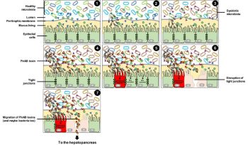 Tuy nhiên, sự xâm nhập của vi khuẩn gây bệnh AHPND do V. parahaemolyticus vào môi trường này dẫn đến rối loạn sinh học do cạnh tranh trực tiếp để sinh tồn hoặc giải phóng các chất chuyển hóa có hại vào lòng dạ dày. Những điều kiện rối loạn sinh học này cho phép V. parahaemolyticus tiếp tục nhân lên, định cư và giải phóng độc tố PirAB, từ đó gây viêm và một phản ứng miễn dịch gia tăng trong các tế bào dạ dày tôm.