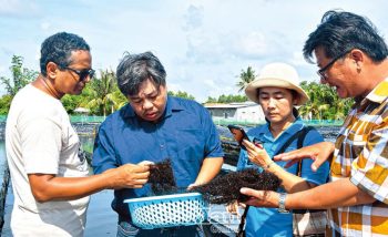 Ông Kazi Ahmed Kabir và ông Nguyễn Nhứt đang kiểm tra rong trong ao nuôi.