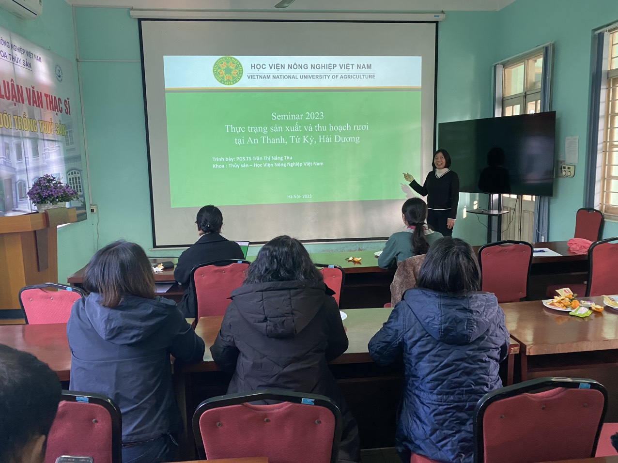 Ngày 23 tháng 11 năm 2023, Nhóm NCM Dinh dưỡng thức ăn & Nuôi trồng thủy sản đã tổ chức seminar về chủ đề sản xuất rươi hữu cơ tại Hải Dương. Tham dự seminar có các thầy cô trong nhóm nghiên cứu mạnh Dinh dưỡng thức ăn & Nuôi trồng thủy sản và một số sinh viên khoa Thủy sản. PGS.TS. Trần Thị Nắng Thu đã trình bày bài seminar “Thực trạng sản xuất và thu hoạch rươi tại Thanh, Tứ Kỳ, Hải Dương”. Bài trình bày nêu rõ thực trạng về quy hoạch vùng sản xuất rươi trong đê và nội đồng. Khu vực nội đồng trước đây trồng lúa là chính, nay đã được quy hoạch để phát triển thêm sản phẩm rươi, cáy nhờ có sự đầu tư mở mới cống Sồi. Việc nuôi rươi hữu cơ đi song song với trồng lúa, các ruộng trồng lúa được người dân canh tác theo phương thức hữu cơ nhằm mục đích tạo điều kiện môi trường tốt nhất cho con rươi sinh trưởng và phát triển. Đối với người dân, việc con rươi sính sản, lấy thức ăn, sinh trưởng như thế nào vẫn còn là câu hỏi chưa có câu trả lời. Người dân hiện tại làm theo kinh nghiệm và cũng đang liên tục thử nghiệm áp dụng những giải pháp khoa học công nghệ mới. Năng suất rươi của các hộ rất khác nhau, dao động từ 5-100kg/sào, trung bình đạt 50kg/sào, chất lượng rươi An Thanh được đánh giá là tốt nhất cả nước, giá thành bán được cũng thường được cao nhất, dao động năm 2023 trong khoảng 250-400 nghìn đồng/kg, tùy thời điểm thu hoạch và chất lượng rươi của từng hộ. Việc thu hoạch rươi được thực hiện thủ công và sau khi thu rươi, phần lớn người dân bán trực tiếp cho thương lái tại ruộng. Chỉ có 1 số gia đình có tủ đông, sẽ giữ lại một phần để chờ khi có giá cao sẽ bán.