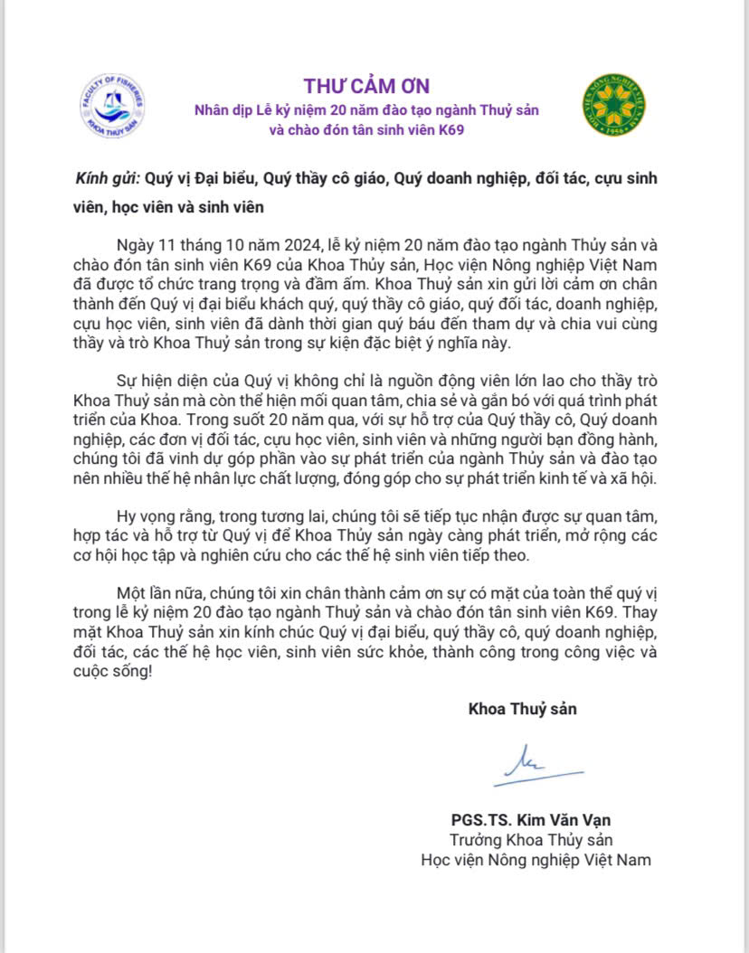 Hoạt động công đoàn, Hoạt động dịch vụ xã hội, Hoạt động đào tạo, Hoạt động KHCN-HTQT, Tin tức Thư cảm ơn Nhân dịp Lễ kỷ niệm 20 năm đào tạo ngành Thủy sản và chào đón tân sinh viên K69 Ngày đăng: 14/10/202414/10/2024 by Đặng Tiến Dũng Tin cùng thể loại 21 loại cây thủy sinh đẹp cho bể cá tại nhà Mực lá – Đối tượng nuôi tiềm năng trong phát triển thủy sản Nghề nuôi hàu hoá thành thương hiệu du lịch độc đáo Khan hiếm nguồn nhân lực Ngành Nuôi trồng Thủy sản Việt Nam và Solomon mở ra giai đoạn hợp tác mới về thủy sản và phát triển bền vững